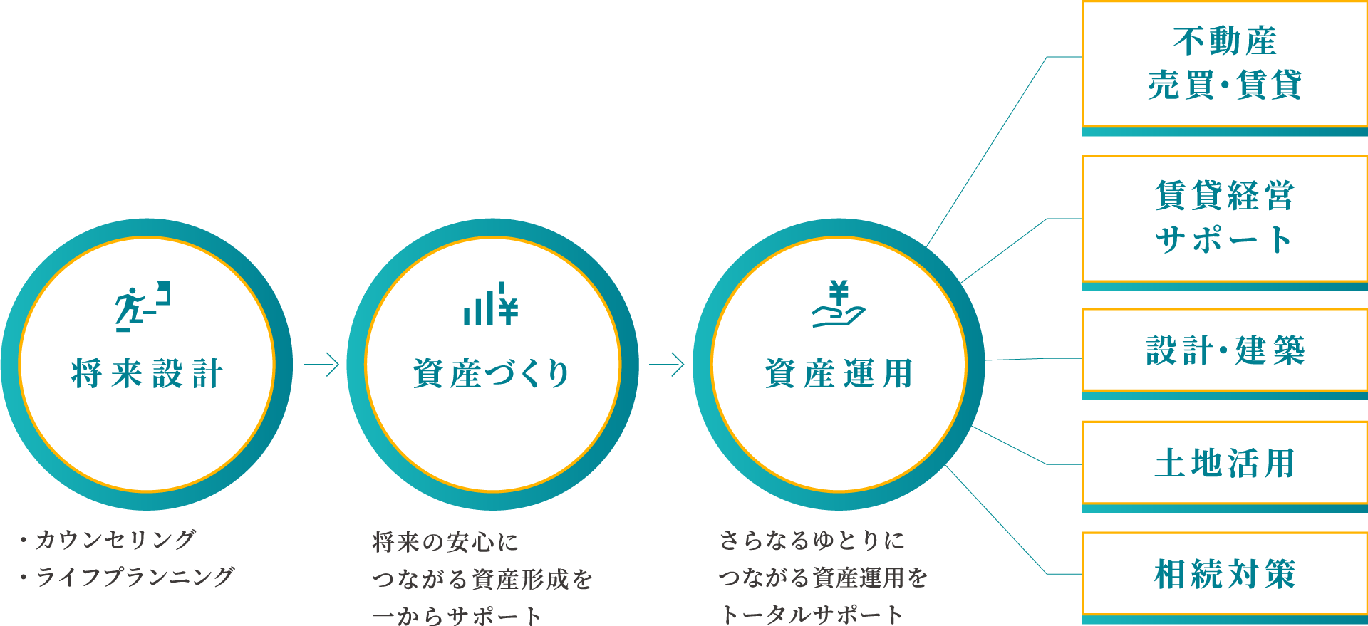 不動産のプロの視点から、「資産づくり」や「資産運用」を始めるための一歩目となるライフプランニングを行い、将来にそなえた、ゆとりある資金計画をご提案いたします。